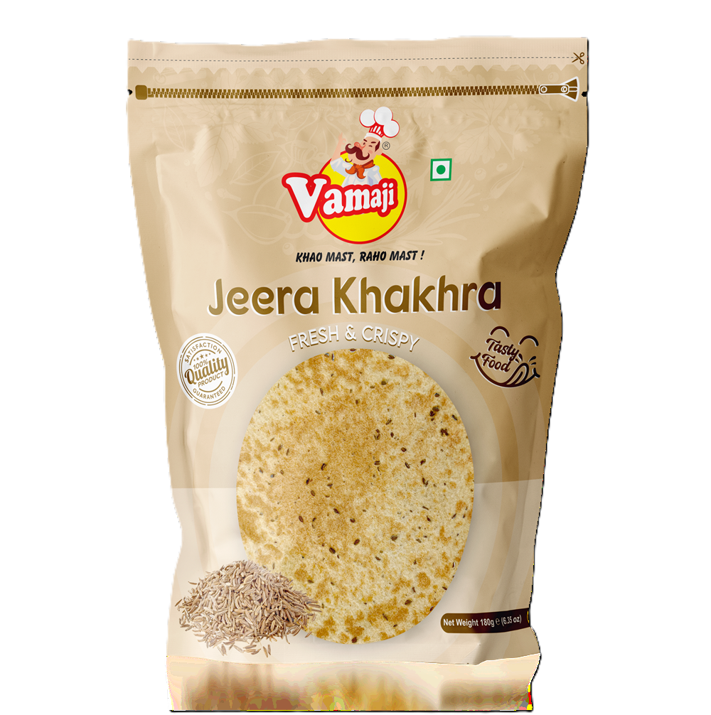 Description: Khakhra Sada Jeera is a popular and most preferred flavour for everyone. It is made by roasting a khakhra on tawadi and adding cumin which contributes to the taste and texture of the khakhra. These khakhra comes in a big size and are easy to carry as it is light weight.